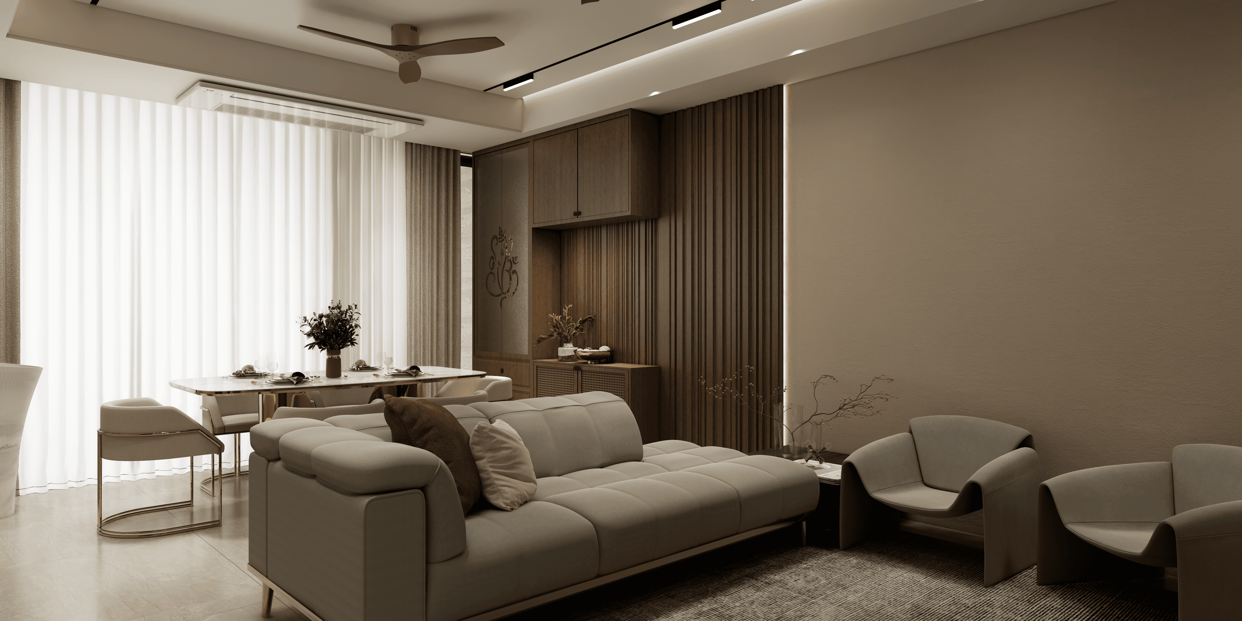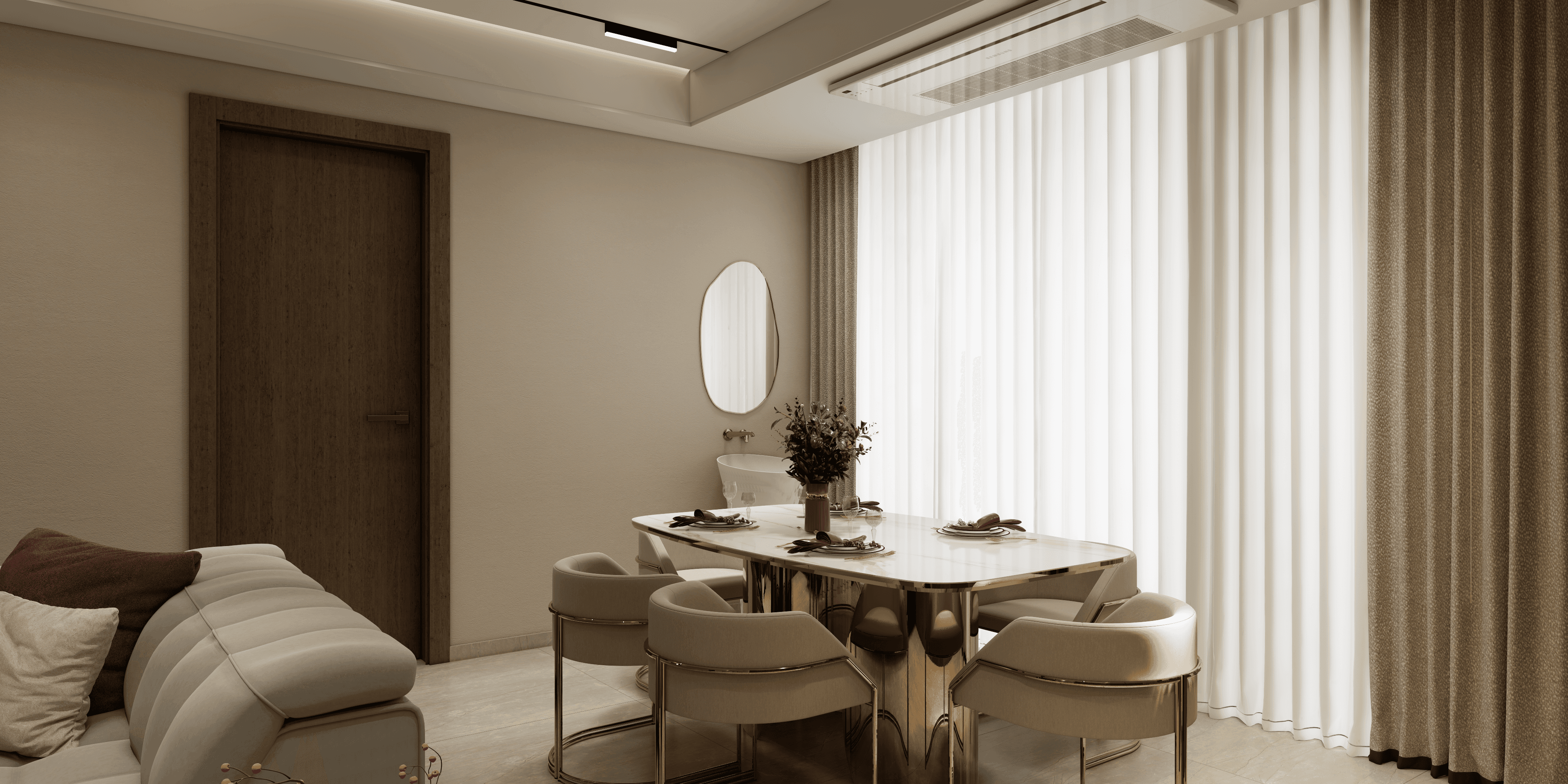 Set in the charming neighbourhood of Gopalapuram, Maison B was envisioned as a statement of elegance and bold personality. The client sought a residence that reflected the essence of Modern Glam—a style that seamlessly merges contemporary design with touches of opulence, sparkle, and theatrical flair. Our challenge was to bring this vision to life with sophistication, cohesion, and balance. Our approach began with a layered material palette—clean base tones of ivory and taupe, contrasted with deep jewel hues like emerald, sapphire, and midnight black. We introduced reflective surfaces—mirrored finishes, high-gloss lacquers, and metallic accents in brushed brass and rose gold—to create a sense of richness without overwhelming the space. The layout was designed for drama and flow. Statement lighting became a defining element: cascading crystal chandeliers, sculptural pendant lights, and gold-accented wall sconces elevated each space with a luxurious glow. Furnishings were custom-crafted with velvet, leather, and marble—sleek silhouettes with detailed trims, channel tufting, and bold textures. Wall panelling, accent mouldings, and fluted finishes added architectural interest, while curated art and décor pieces added layers of glamour and individuality. From the powder room to the master suite, each space had its own identity yet flowed harmoniously under the same stylistic umbrella. Smart storage solutions were integrated seamlessly, ensuring that the glam never came at the cost of function. The client was especially pleased with how the design maintained a high-end aesthetic without feeling ostentatious. Maison B stands today as a modern-day residence where sparkle meets sophistication. It is a bold yet balanced interior that reflects the client’s vibrant personality—stylish, expressive, and undeniably glamorous—while offering the comfort and function of a truly liveable home.